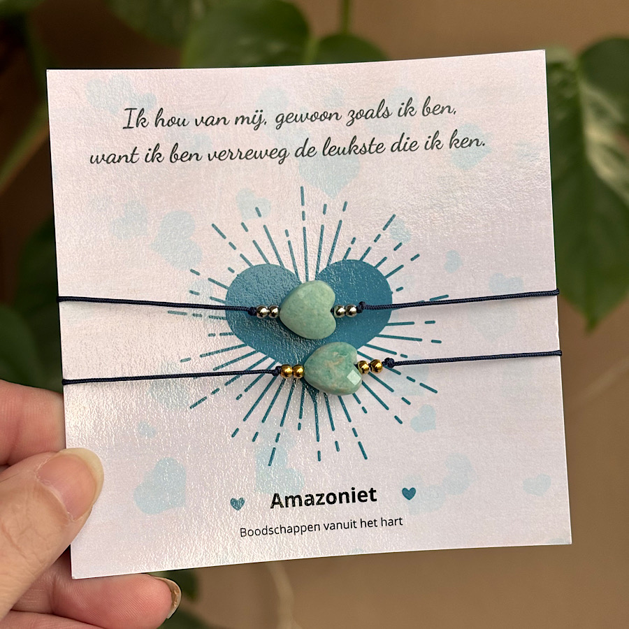 De armband met edelstenen – Ik hou van mij | amazoniet is er voor diegene die wel wat extra (zelf)liefde kan gebruiken. Deze armband met betekenis draagt jouw liefdevolle boodschap. Het komt met een bijpassend kaartje met een mooie intentie: Ik hou van mij, gewoon zoals ik ben, want ik ben verreweg de leukste die ik ken. Het is ook mogelijk om een kaartenstandaardje erbij te bestellen zodat je het kaartje nog kunt gebruiken als mooie herinnering. Dit standaardje is handgemaakt van klei.