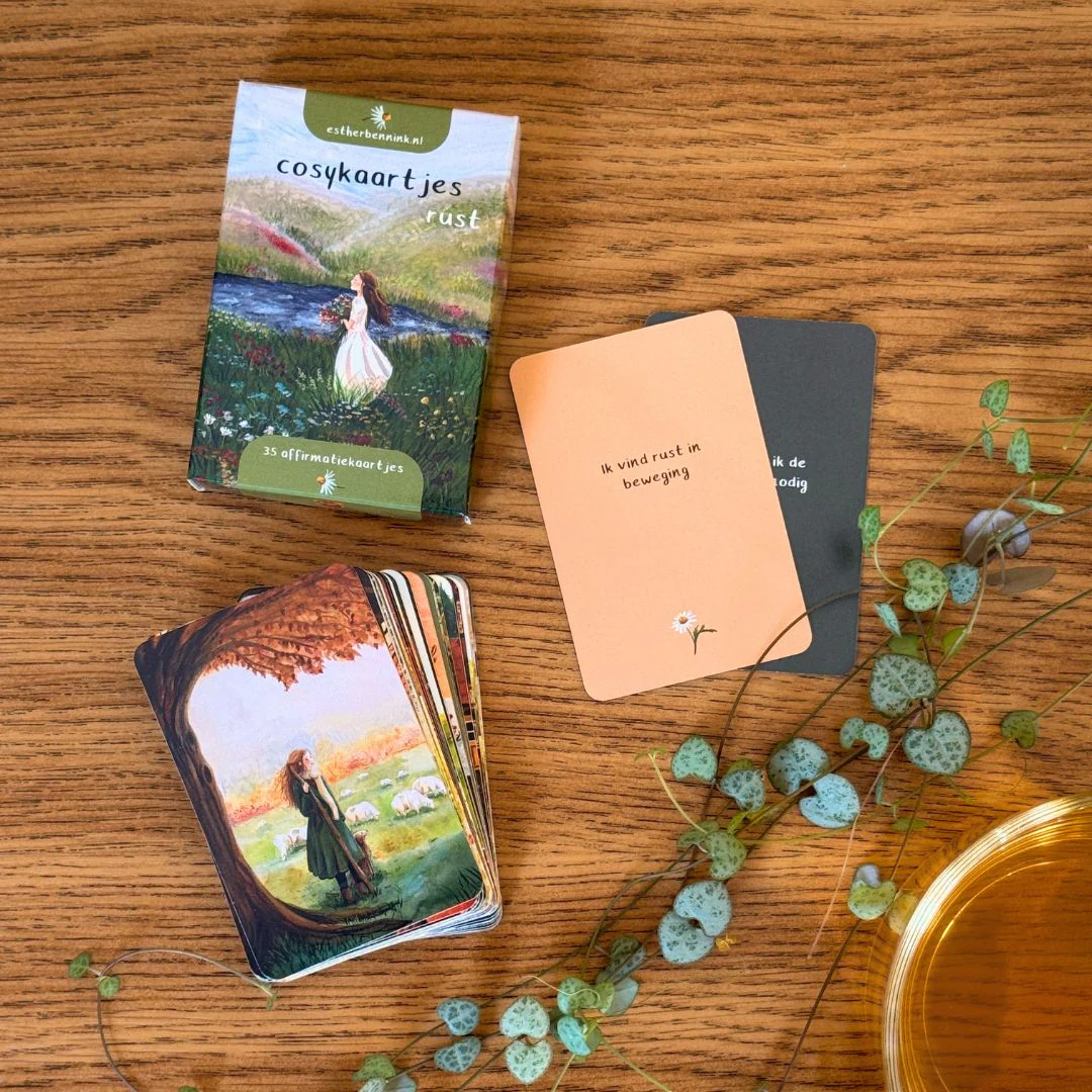 Geef jezelf rust met deze affirmatiekaartjes. Alle kaartjes hebben het thema rust en balans als basis. Beleef de cosy illustraties, kies op gevoel en vertrouw de boodschap.