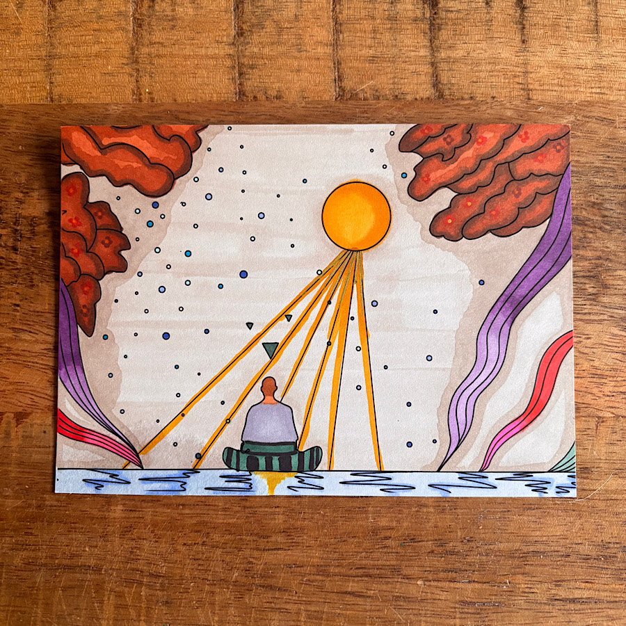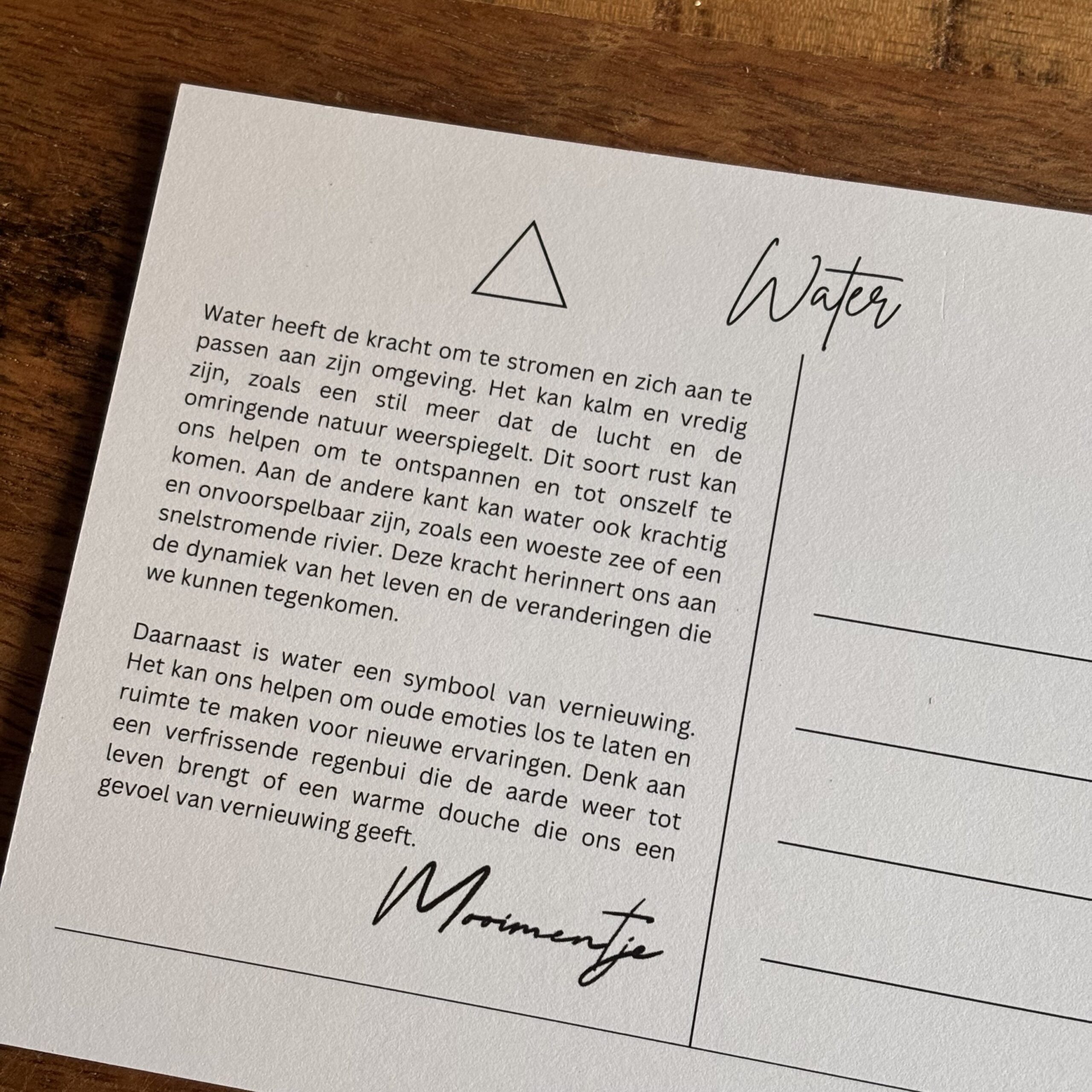 Laat je creativiteit stromen met deze unieke, speciaal voor Mooimentje ontworpen in te kleuren postkaarten. Deze zijn geïnspireerd op de vier elementen: lucht, water, aarde en vuur. Elk element staat symbool voor een bepaalde energie. Lucht voor zuurstof en adem, vuur voor passie en warmte, aarde voor stabiliteit en veiligheid en water voor vernieuwing en aanpassingsvermogen. Samen vormen ze een een stabiele set die raakt en verbindt.