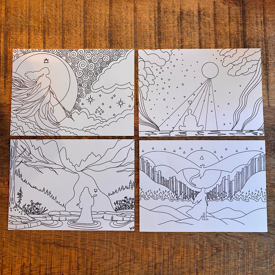 Zelf in te kleuren postkaarten – de 4 elementen: lucht, water aarde en vuur